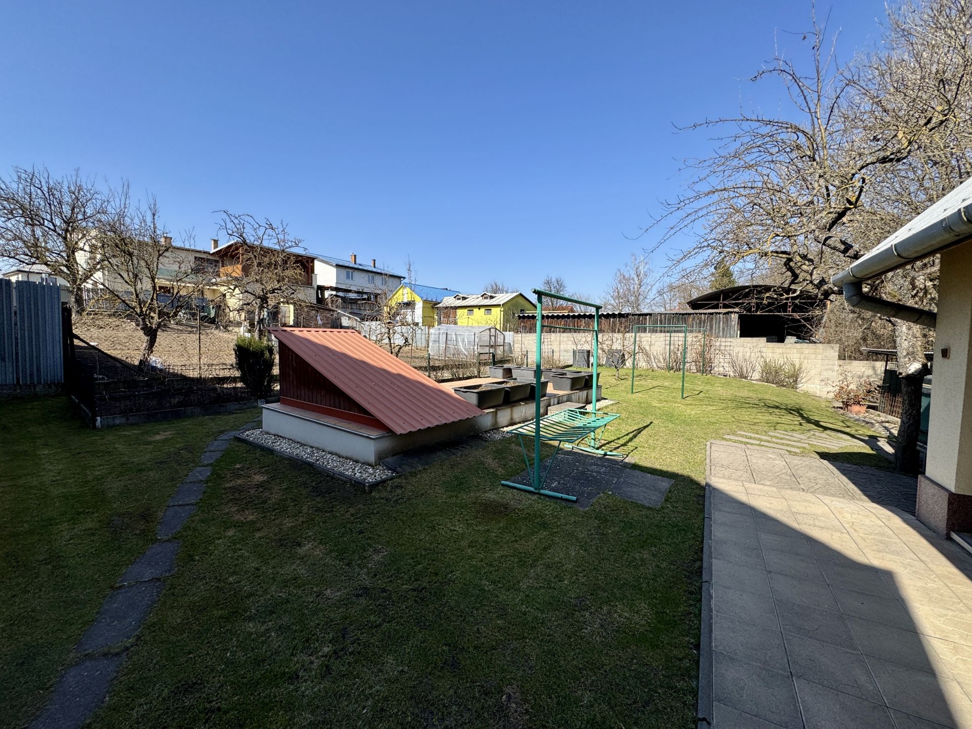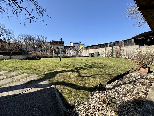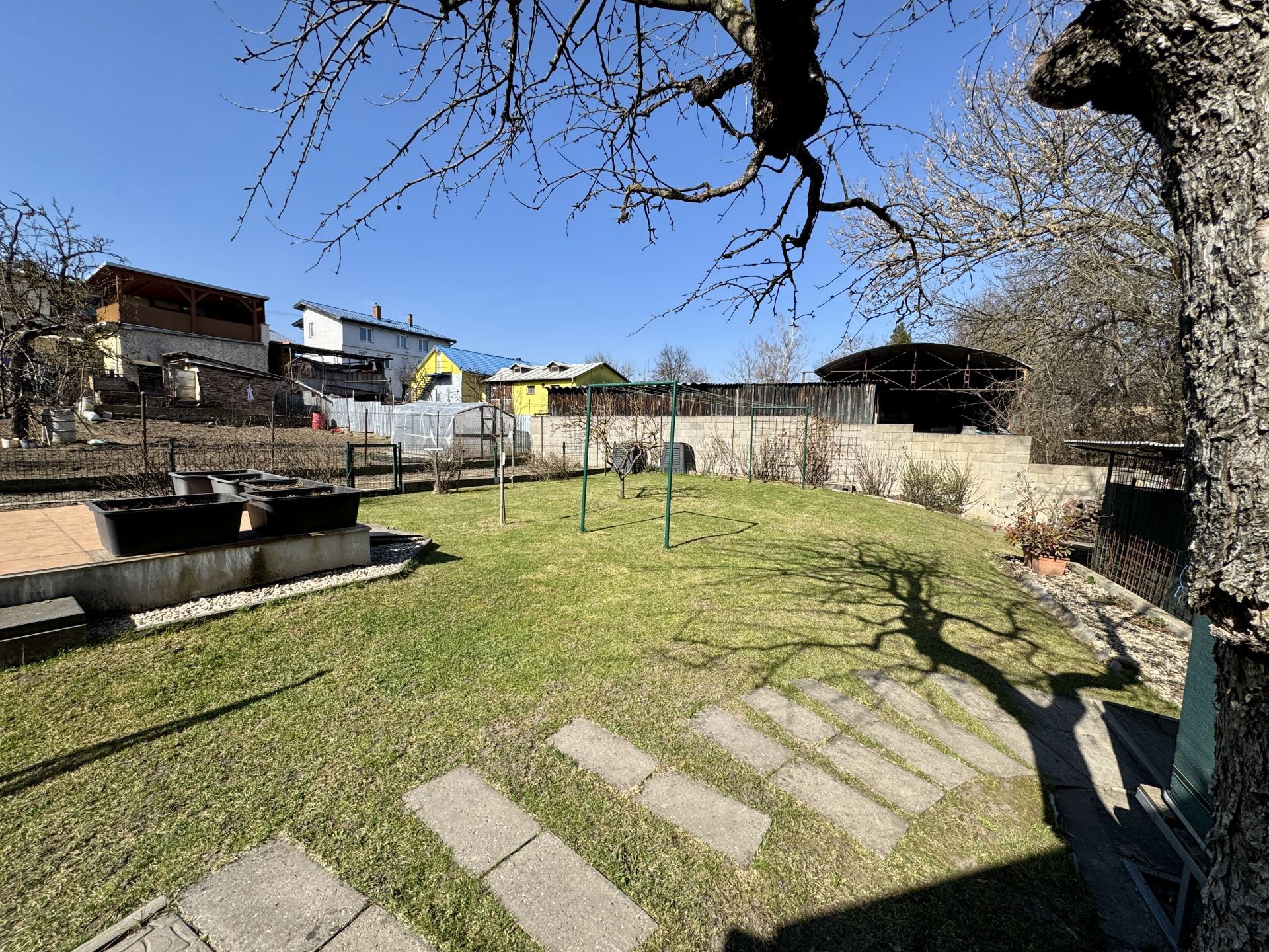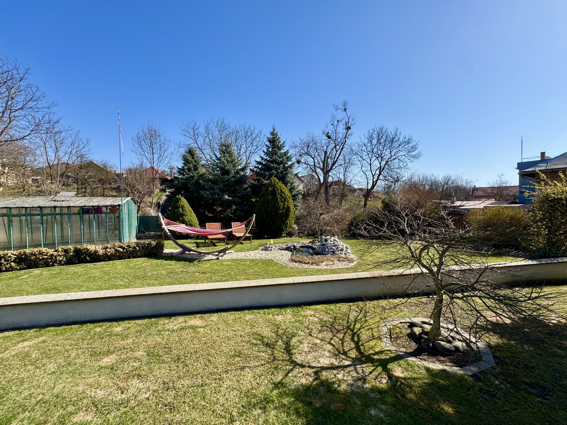 Záhrada: Udržiavaný trávnik, veľký skleník a priestor na vlastnú zeleninu. Trampolína pre deti v cene!