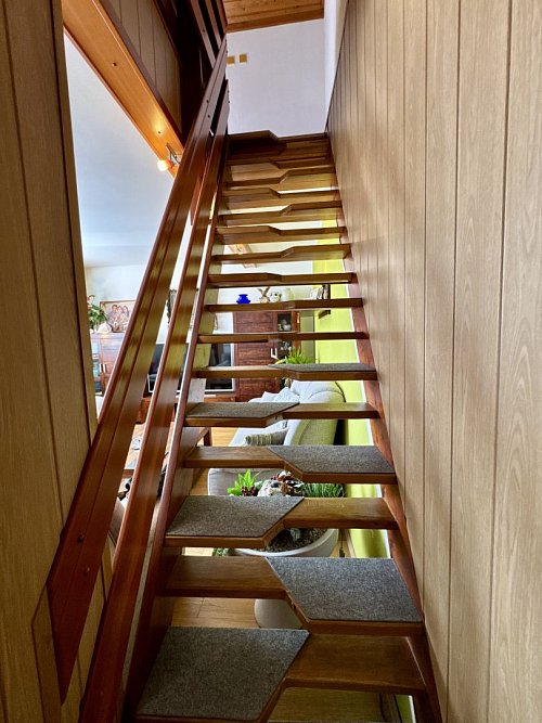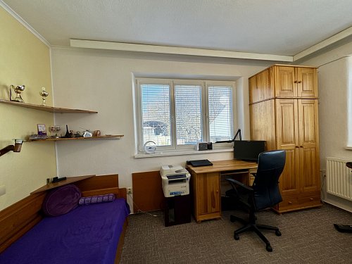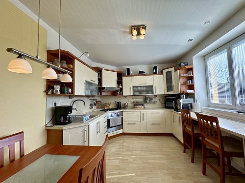 Prízemie: Kuchyňa s plynovým sporákom, elektrickou rúrou a digestorom. Priestranná obývačka s podlahovým kúrením a štýlovým schodiskom. Rozľahlá spálňa, izba s výhľadom do záhrady, kúpeľňa spojená s WC, špajza.