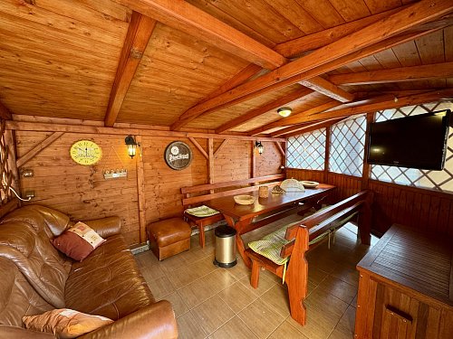 "Fanúšikovský" altánok: Masívny, krytý altánok so zavedenou TV – ideálne miesto na sledovanie hokeja či futbalu s priateľmi.