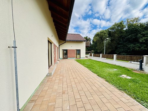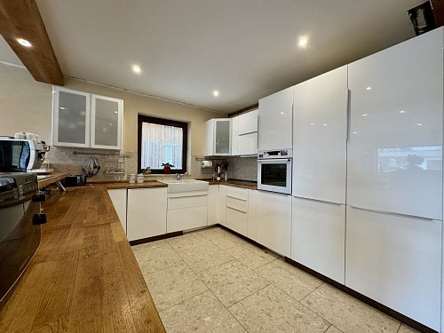 Prízemie: moderná kuchyňa spojená s obývacou izbou a jedálňou, kúpeľňa, 2 samostatné izby, fitness a miestnosť pripravená na wellness.
